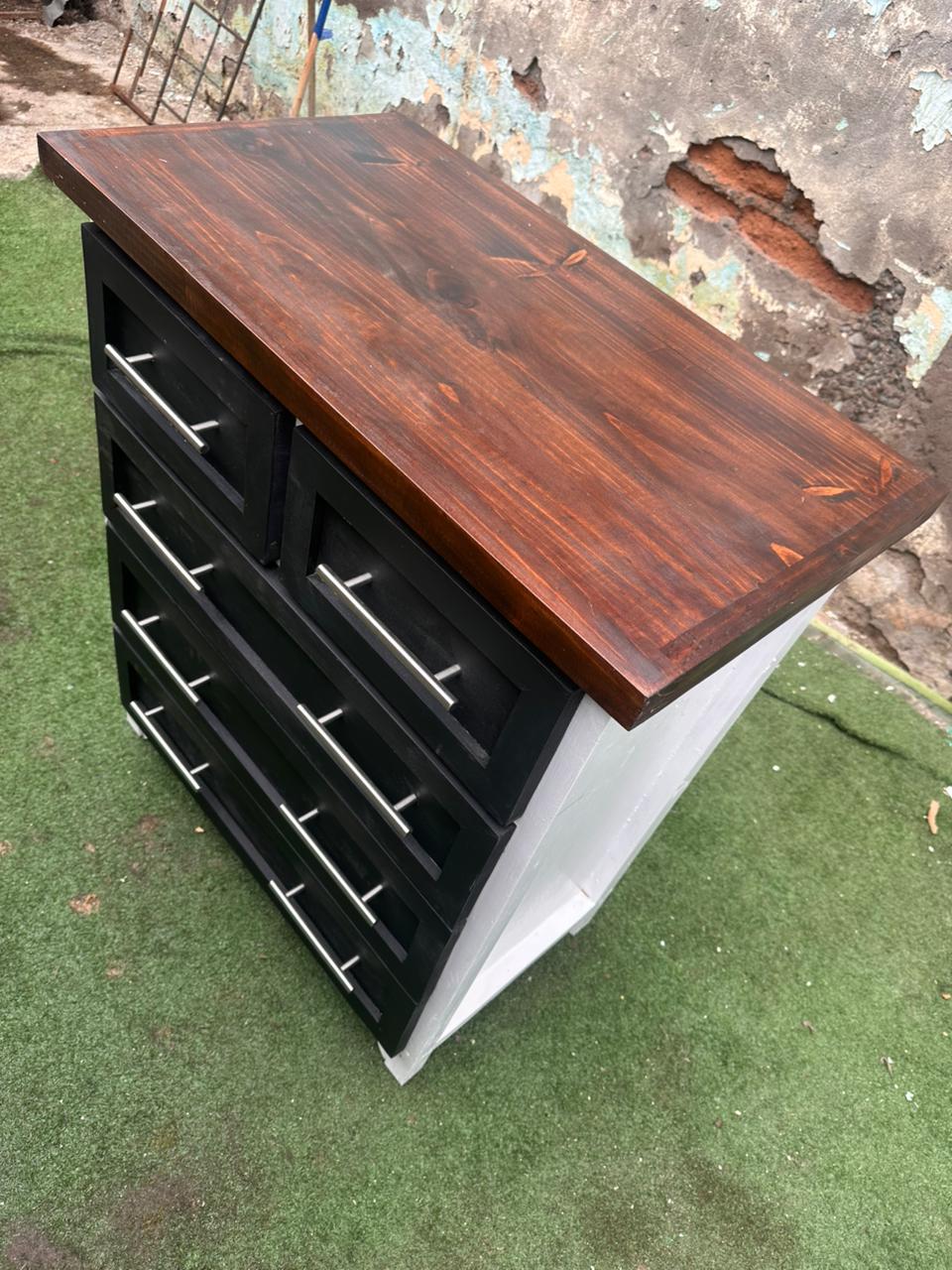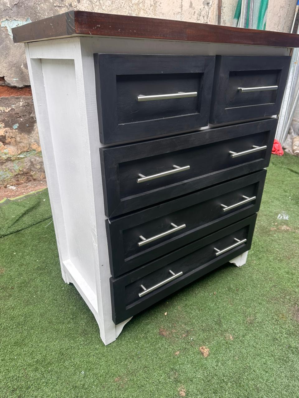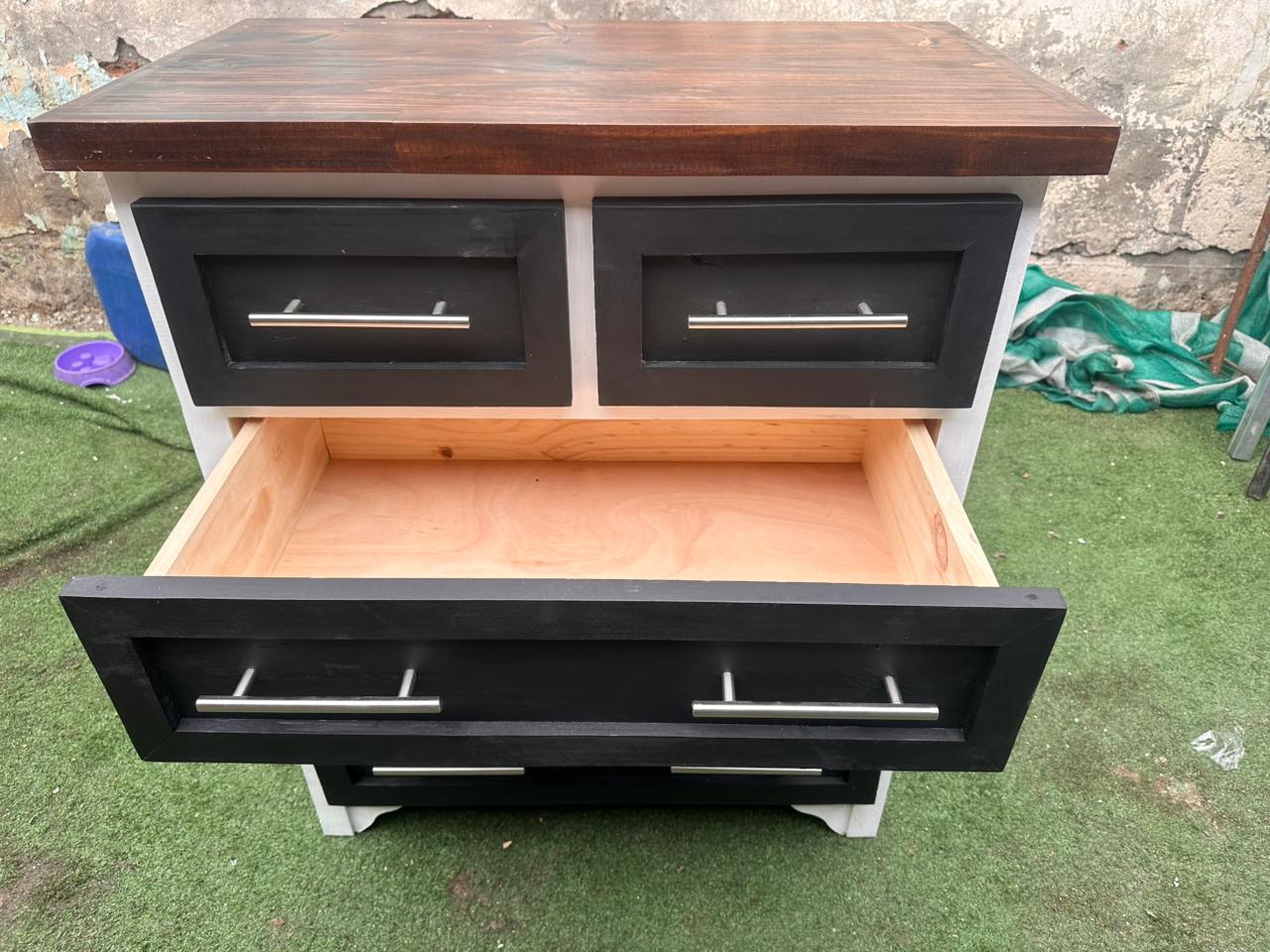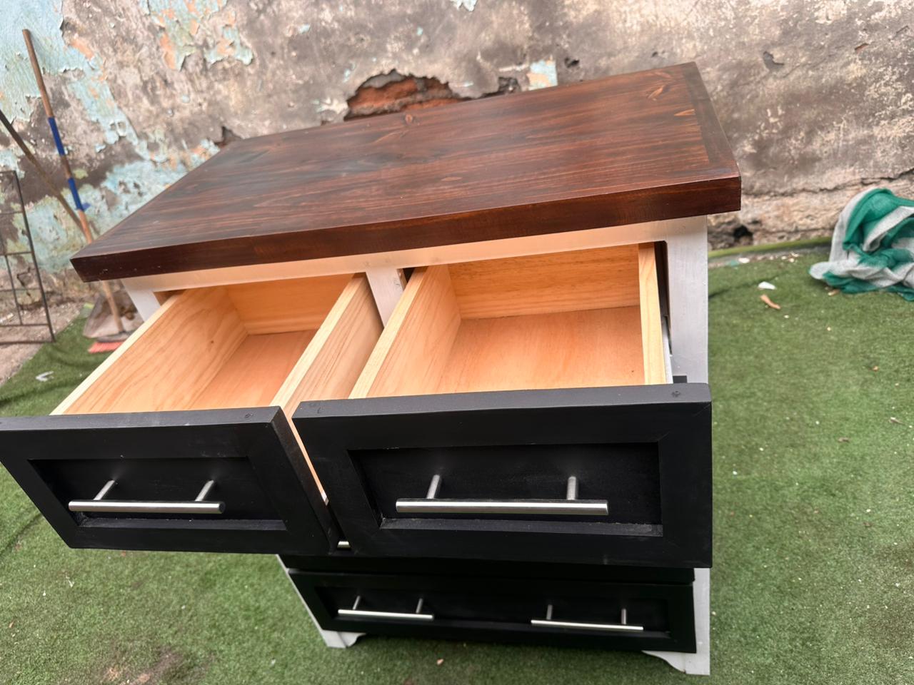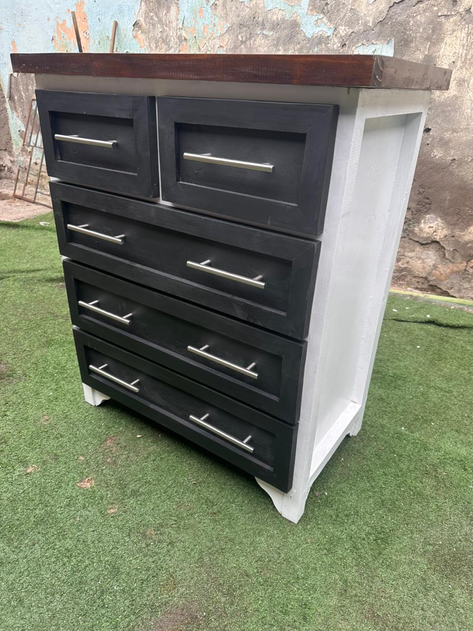 Funcionalidad: 5 cajones amplios (2 superiores pequeños + 3 grandes) con tiradores metálicos modernos.
