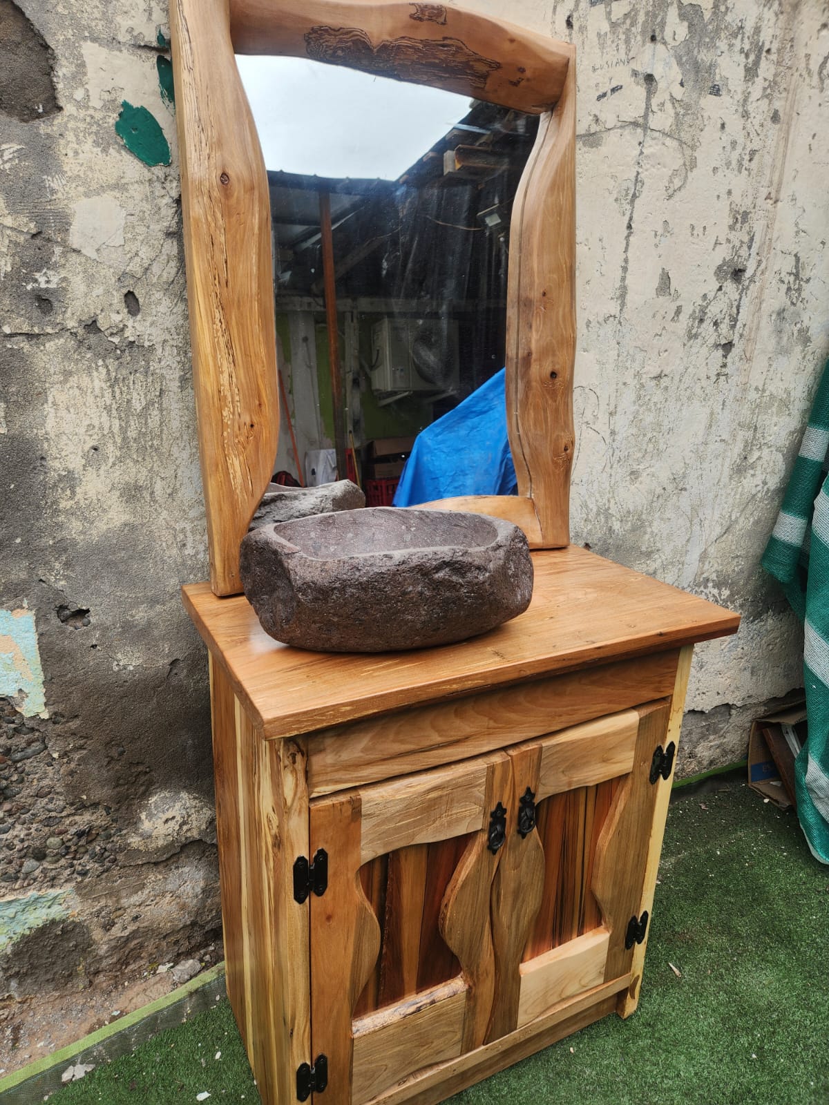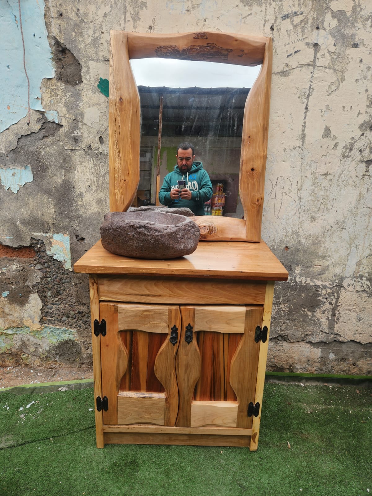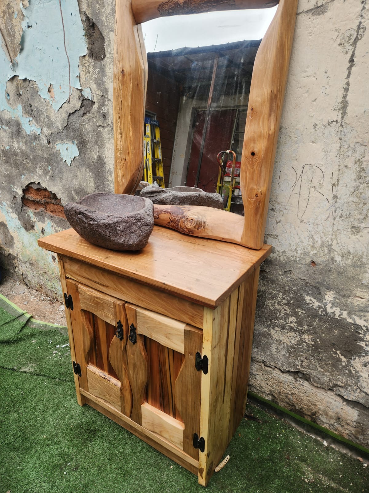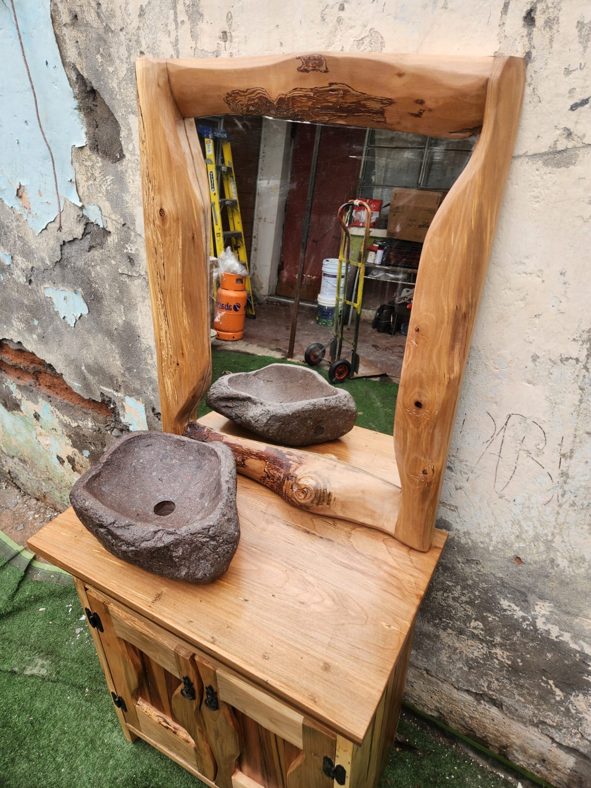 Vanitorio artesanal construido en roble macizo con detalles en alerce recuperado. Incluye lavamanos de piedra de río y espejo con marcos orgánicos que conservan la forma natural de la madera. Ideal para baños rústicos, cabañas o espacios con carácter.
