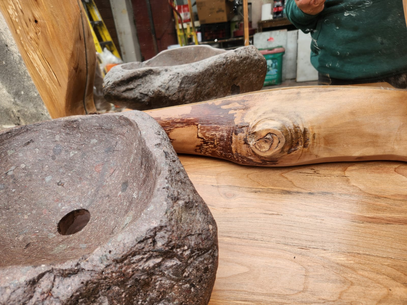 Vanitorio (2) rústico de Roble con detalles en Alerce + lavamanos de piedra