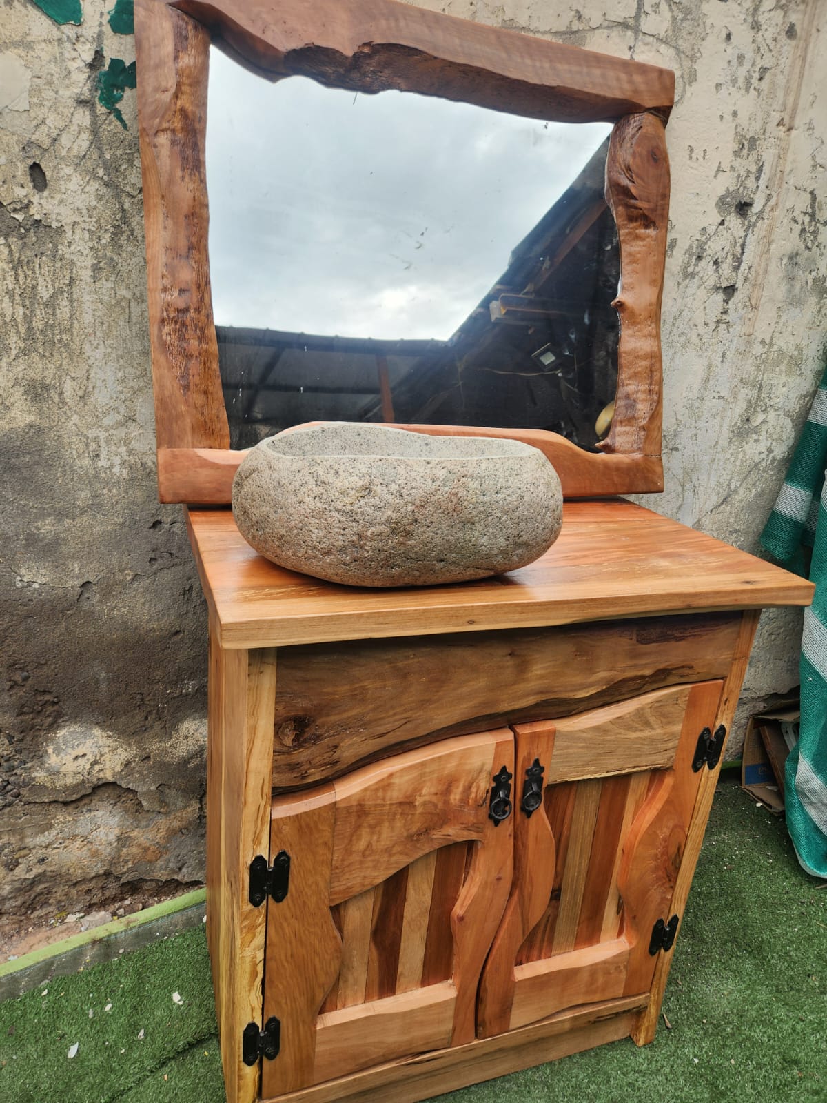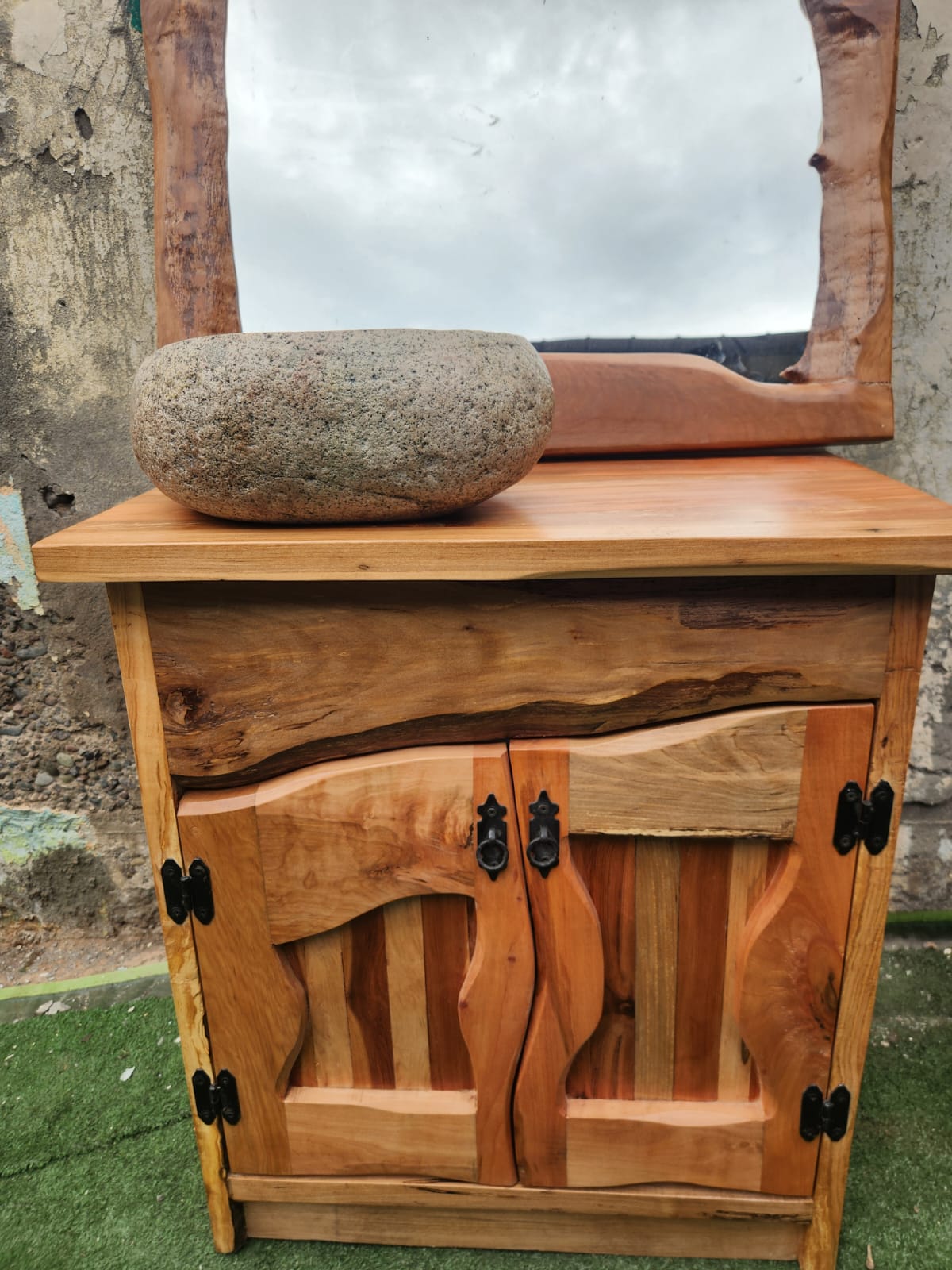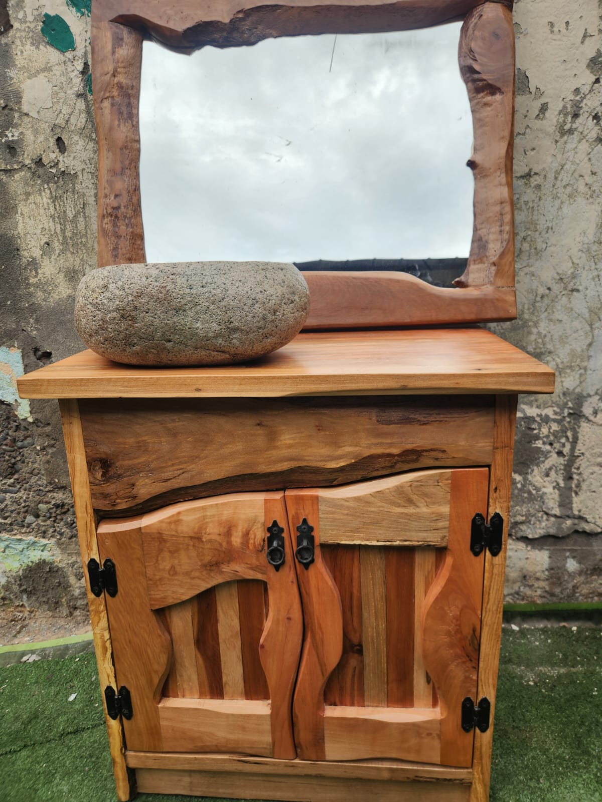 Hecho a mano. Pieza única con espejo integrado y veta natural.